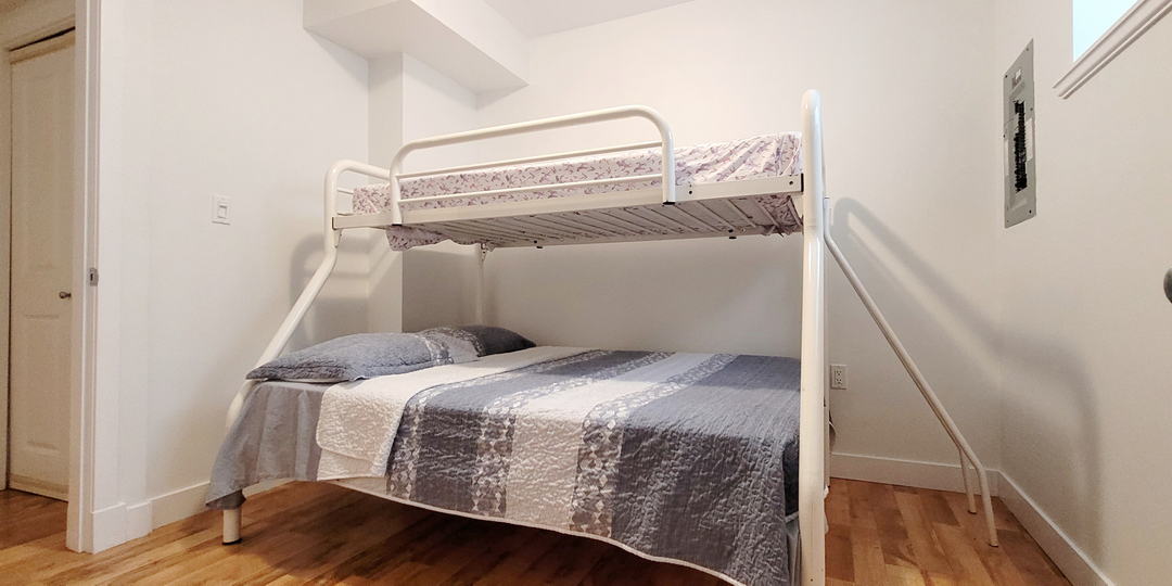 - Perfect for bunk bed enthusiasts, the Junior suite offers a cozy queen-size lower bed, suitable for two adults, with space for one or two children on the twin-size top bunk. Enjoy natural light from the window, comfortable seating with a chair, and additional illumination from a standing lamp. Store your belongings in the closet provided. Junior suite is typically reserved alongside with the Queen Suite.